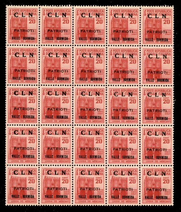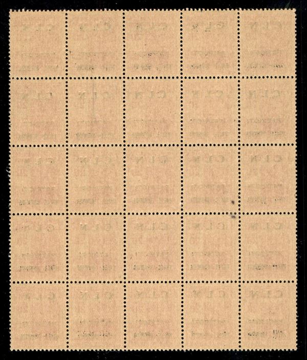 1945 - 20 cent (2 varietà) - blocco di 25 (mezzo foglio) con soprastampe spostate e inclinate dall'alto in basso - gomma integra - spaziature verticali delle soprastampe tra i valori diverse - non catalogato