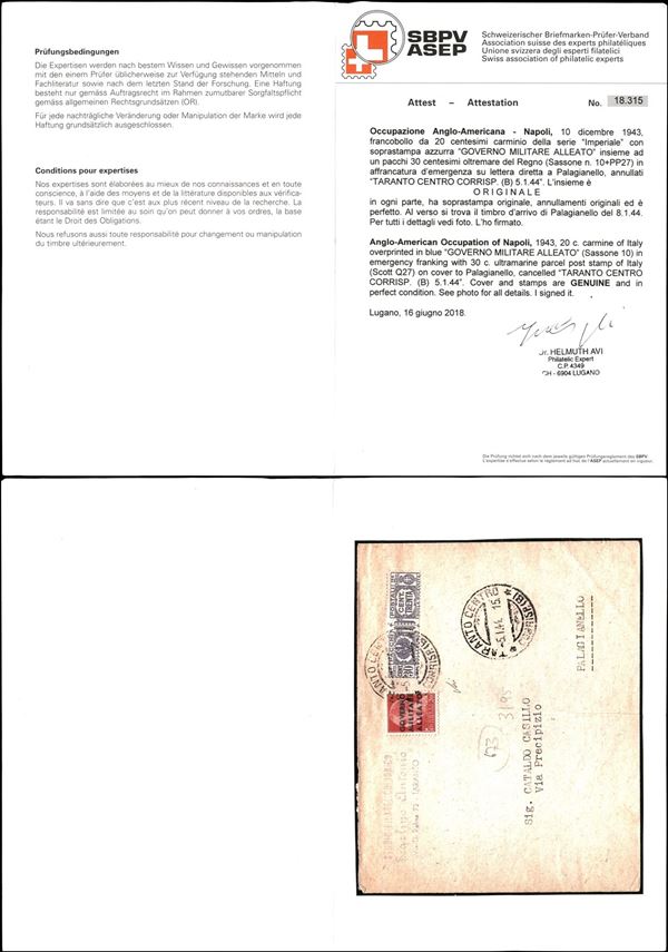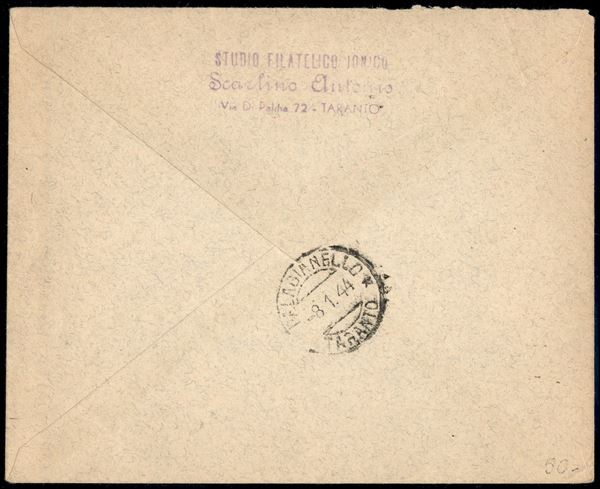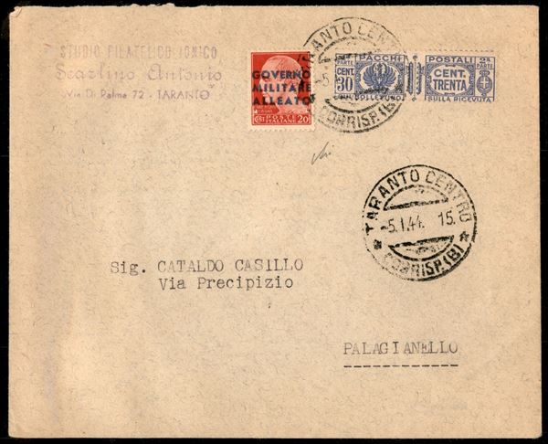 20 cent Governo Militare Alleato (1 Napoli) + 30 cent Pacchi (27) - busta da Taranto a Palaganello del 5.1.44 - cert. Avi