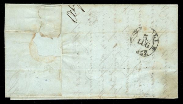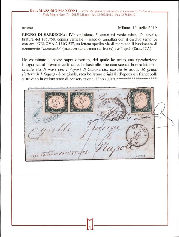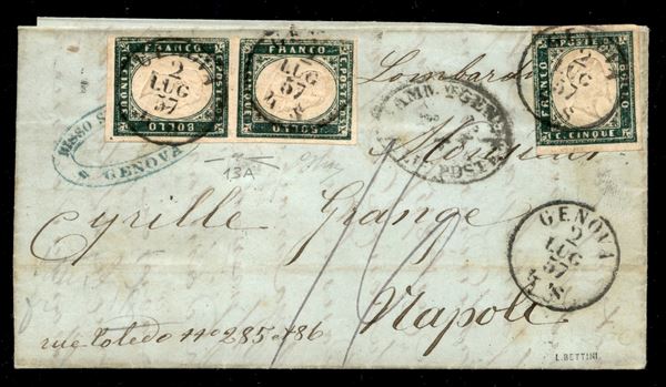 5 cent verde mirti (13A) - coppia + singolo su lettera da Genova a Napoli del 2.7.1857 col vapore Lombardo - margini perfetti - G. Oliva + cert. Manzoni