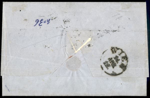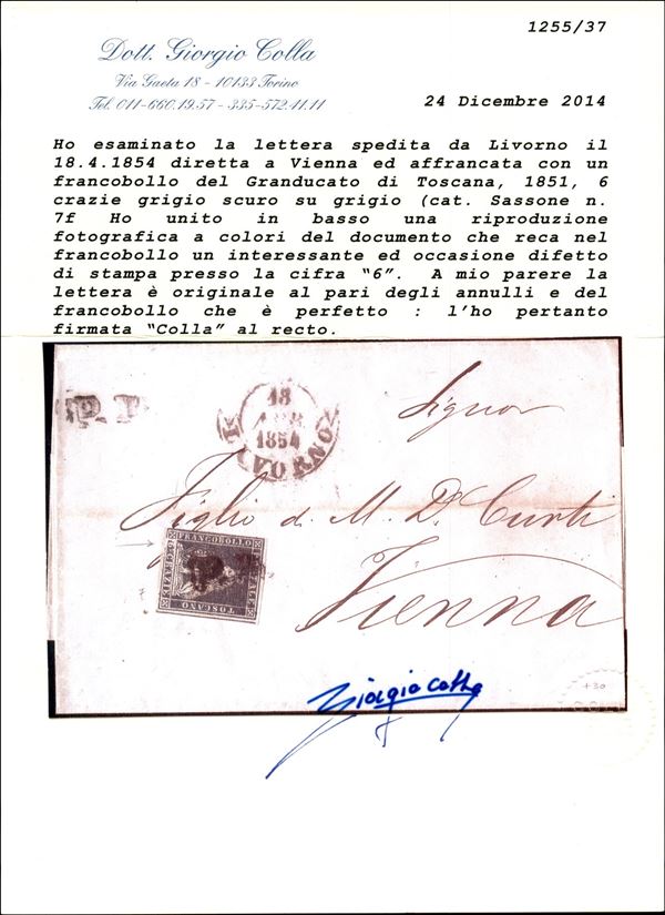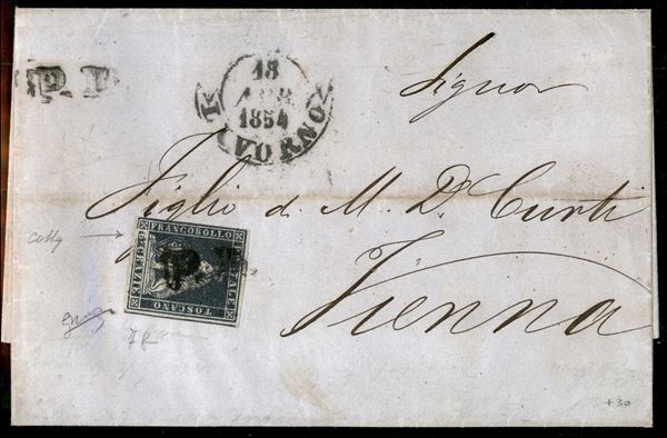 6 crazie grigio scuro (7f) con occasionale difetto di stampa sulla cifra - involucro di lettera da Livorno a Vienna del 18.4.54 - esemplare con margine preciso a sinistra - cert. Colla