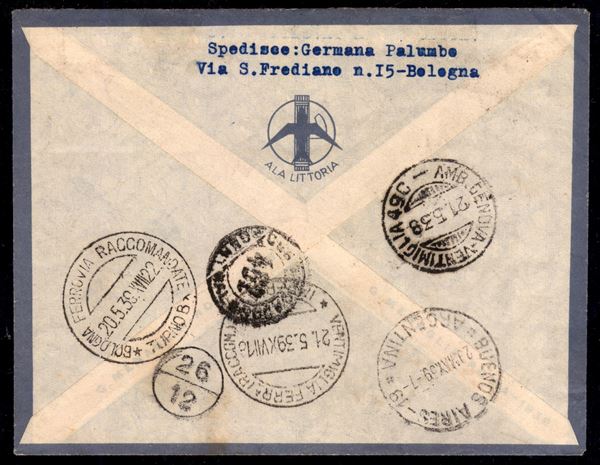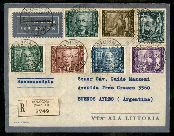 Aerogramma raccomandato affrancato con serie Impero (447+111/116) da Bologna a Buenos Ayres del 20.5.38 - Biondi