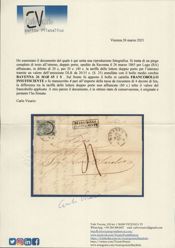 Affrancatura Insufficiente - 20 su 15 cent (25) su lettera completa di testo da Ravenna a Lugo del 26.3.65 - tassata - cert Vicario