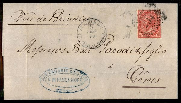 Alessandria d'Egitto (P.ti 13) su busta col numerale a punti (234) su 40 cent Torino (20 - Regno) per Genova del 16.2.73 - diena + cert. Chiavarello