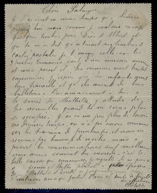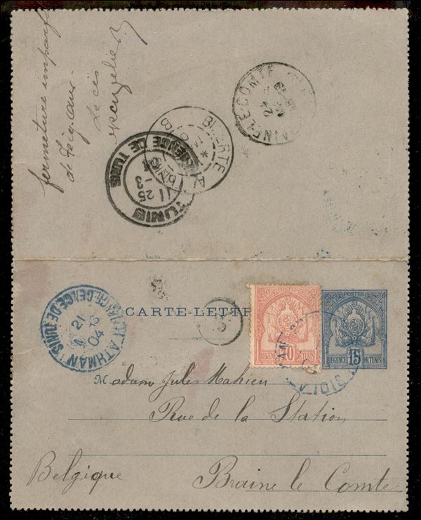 Biglietto postale da 15 cent con complementare (20) da Athman (azzurro) per il Belgio del 21.3.1904