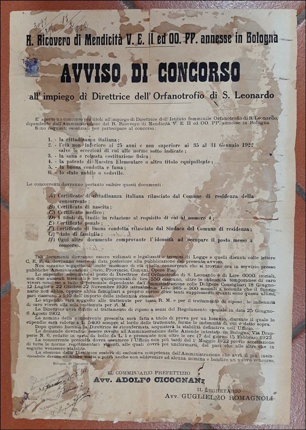Bologna (29.12.21) - Manifesto/Avviso di Concorso per Direttrice Orfanotrofio S. Leonardo - rispedito da Firenze il 18.2.22 dopo l'affissione