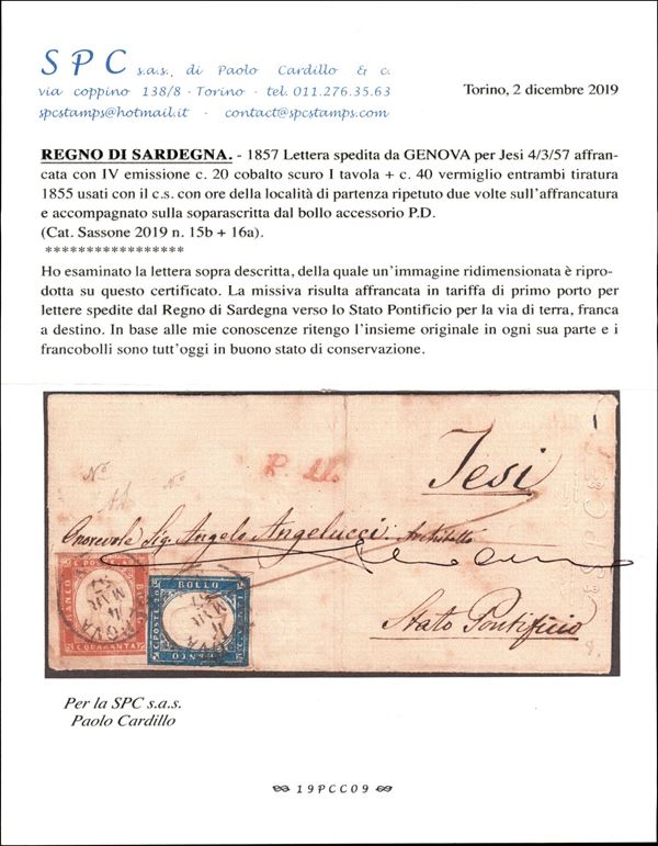 Bustina affrancata con 20 cent cobalto scuro (15b) + 40 cent vermiglio (16a) da Genova a Jesi (Stato Pontificio) del 4.3.57 - Diena + cert. Cardillo