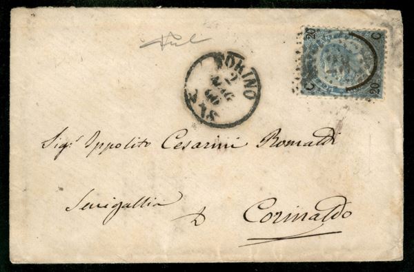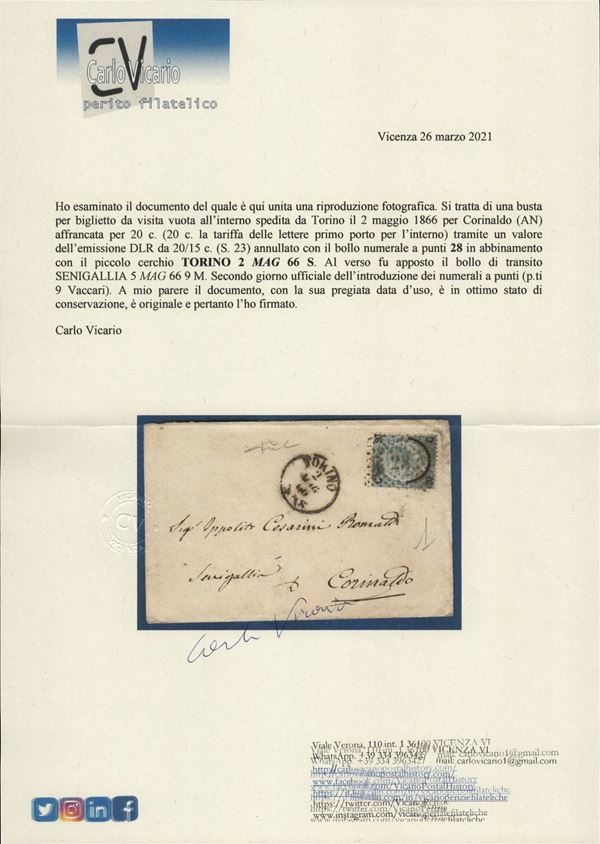 Bustina affrancata con 20 su 15 cent (23) da Torino (numerale 28) a Corinaldo del 2.5.66 - cert Vicario