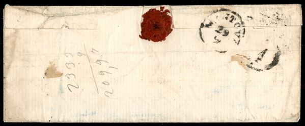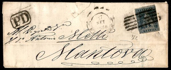 Bustina affrancata con 6 crazie indaco (7e) da Firenze a Mantova del 27.9.56 - esemplare con ampio margine superiore preciso a destra e intaccato sulla sinistra