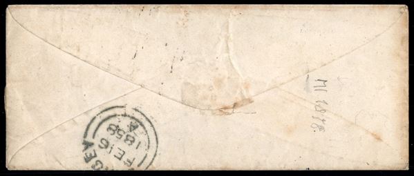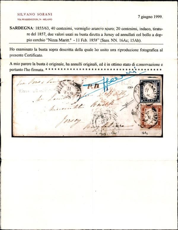 Bustina in tariffa affrancata con 20 cent indaco (15Ab) + 40 cent vermiglio scuro (16Ac) da Nizza Marittima a Jersey (Inghilterra) del 11.2.58 - cert. Sorani