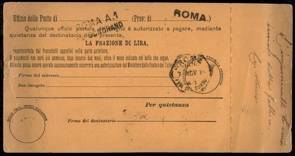 Cartolina Vaglia da 10 cent (V1 - tipo D) con affrancatura aggiunta e unito tagliando di controllo (con solo bollo di partenza) da Roma a Vercelli del 7.11.95 - strappi sui lati verticali