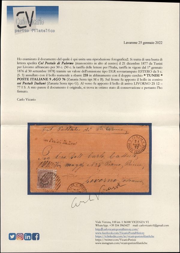 Col Postale di Palermo (corsivo) + Coi Postali Italiani (tipo G) - busta affrancata con 30 cent (6) da Tunisi a Livorno del 21.12.77 - cert. Vicario