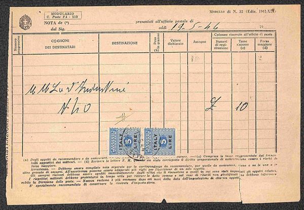 Coppia verticale del 5 lire (8) usata fiscalmente su Modulo N. 32 del 19.5.44 - leggerissima piega verticale sul pezzo inferiore - Sorani