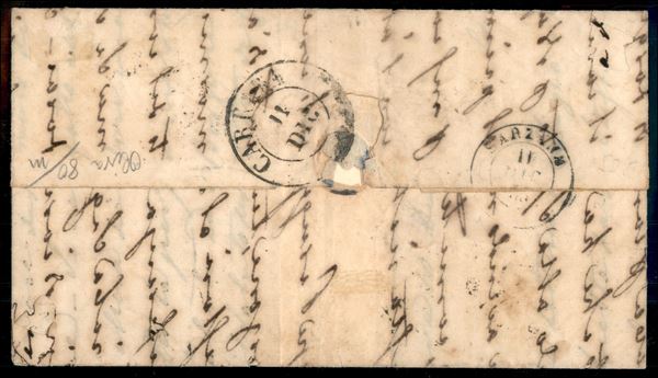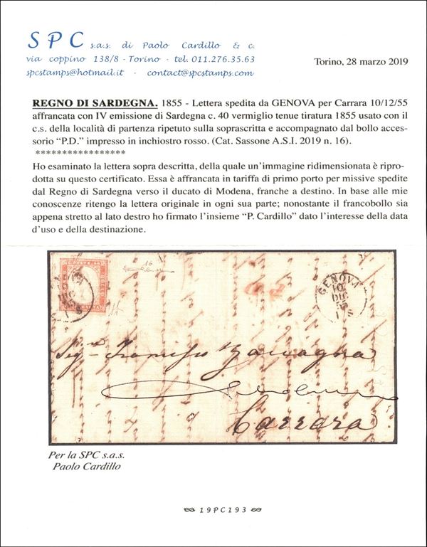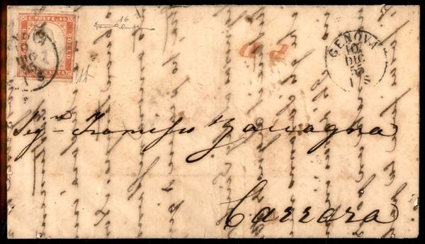 Dicembre 1855 - lettera in tariffa affrancata con 40 cent (16) da Genova a Carrara del 10.12.55 - interessante insieme per data d'uso e destinazione - Diena + cert. Cardillo