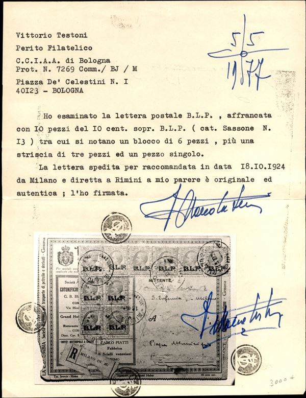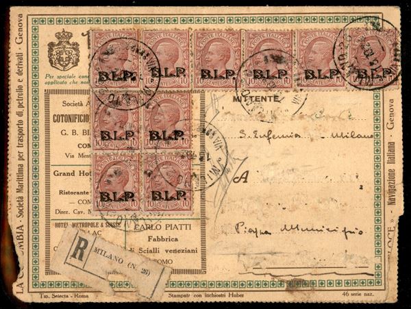 Dieci 10 cent (13) su busta speciale (46 Nazionale) raccomandata da Milano a Rimini del 18.10.24 - indirizzo raschiato (difetto come a tutte le BLP con questa affrancatura) - cert. Testoni