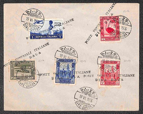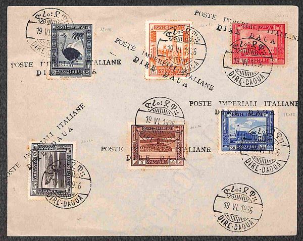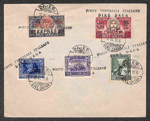 Dire Daua (P.ti 12) + Dire Daua Poste Imperiali Italiane (Pti. R) - Pittorica (174 + 177 + 179/184 + 213 + 215/216 + 222 + 224 + Espressi 6/7) usati su tre buste il 19.6.36 (1200 usati)