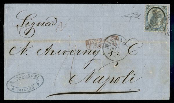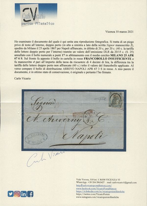 Doppio porto - 20 su 15 cent (25) su piego completo di testo da Milano a Napoli del 25.4.67 - cert Vicario