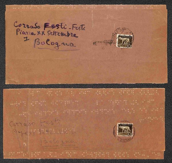Due pieghi Braille affrancati con 5 cent Imperiale (243) da Belluno a Bologna del 14.4/3.5.1942