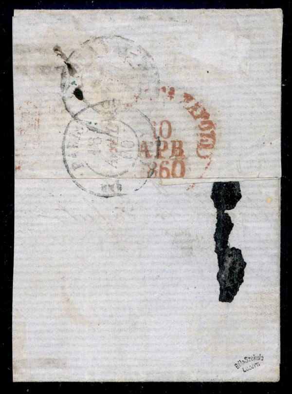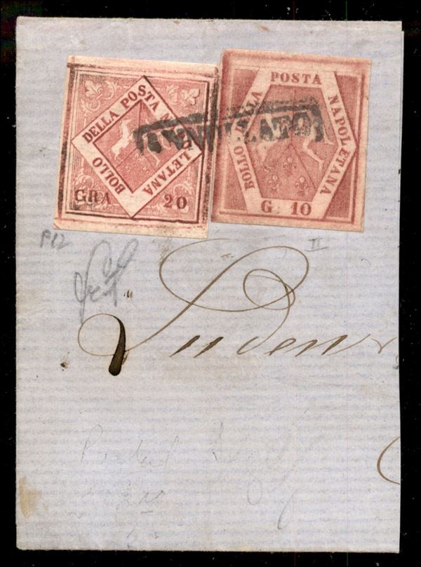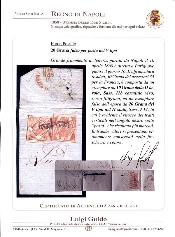 Frode Postale - parte di lettera affrancata con 20 grana (F12) falso V tipo + 10 grana carminio vivo (11b) da Napoli a Parigi del 10.4.60 - cert. L. Guido
