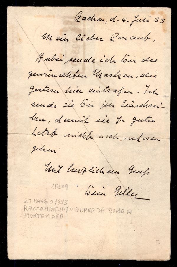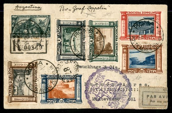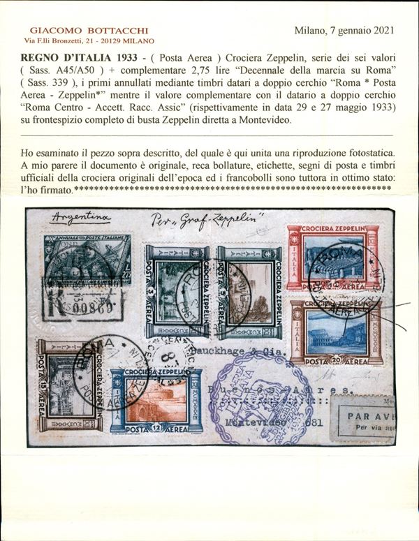 Frontespizio di aerogramma (biglietto) raccomandato affrancato con serie Zeppelin (45/50) + complementari (339) da Roma a Montevideo del 27.5.33 - bollo speciale della Crociera - molto bello - Diena + Raybaudi + Fiecchi + cert. Bottacchi