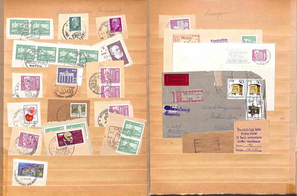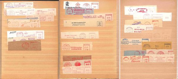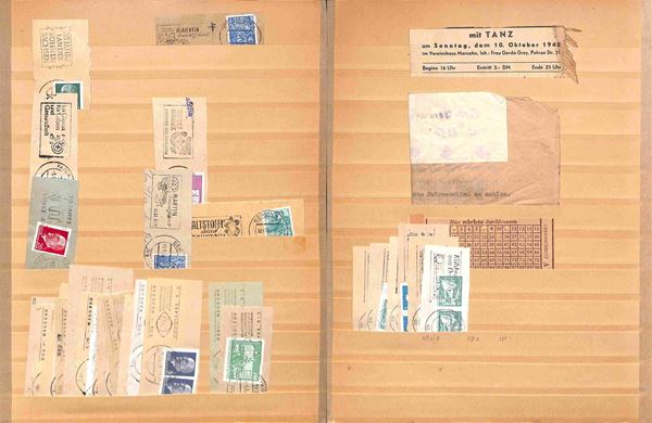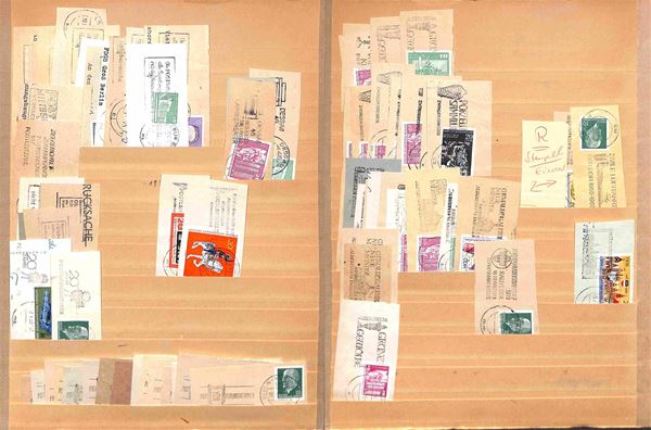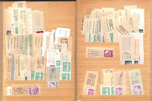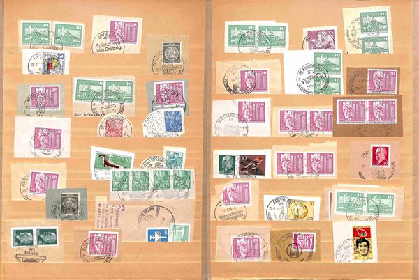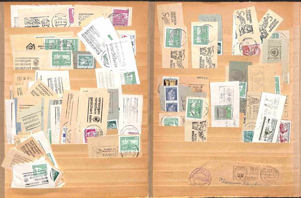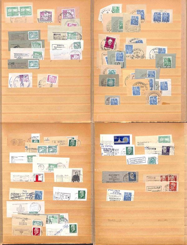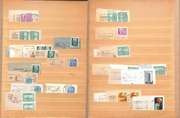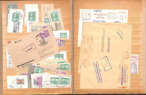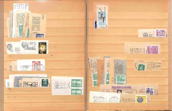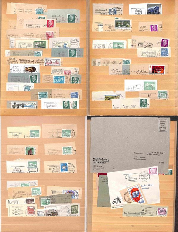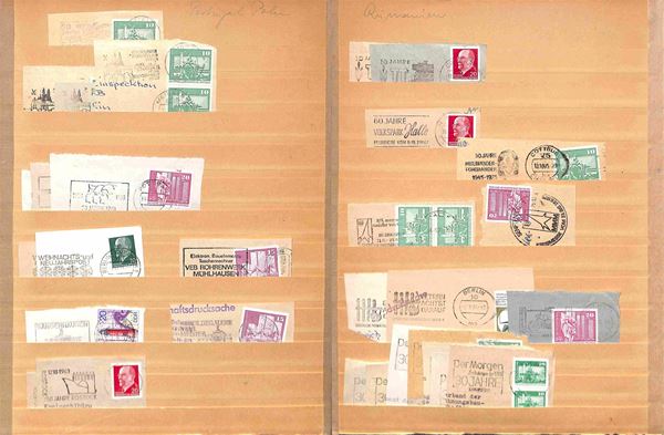 GERMANIA DDR - circa 1950/1990 - 16 grandi pagine di classificatore con centinaia di frammenti applicati e annullamenti speciali e/o a targhetta del periodo + 4 pagine di grande formato con molte decine di ritagli di buste con annullamenti meccanici - da esaminare