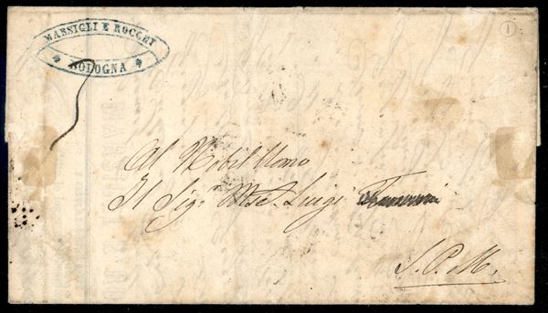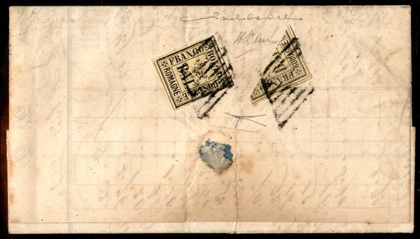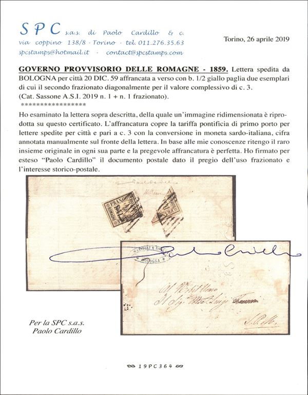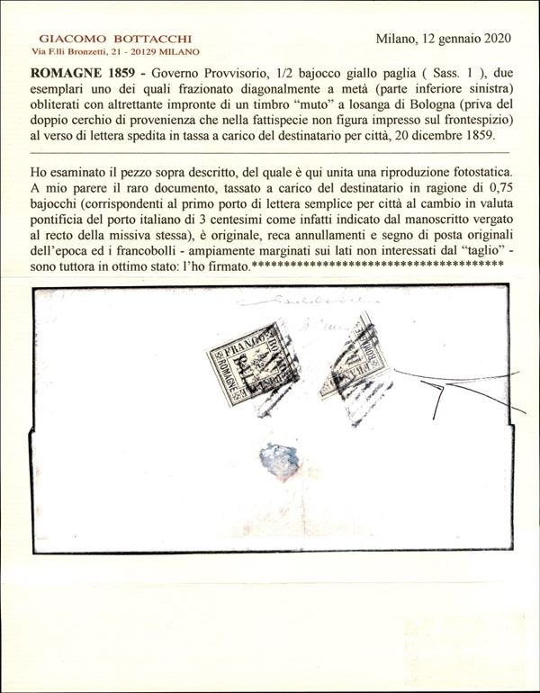 Governo Provvisorio - Due esemplari del 1/2 bajocco (1) uno dei quali frazionato al verso di lettera con tassa a carico del destinatario per Bologna del 20.12.59 - raro documento - note meno di 30 missive - cert. Cardillo + cert. Bottacchi