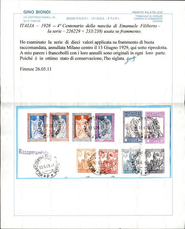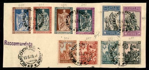 Grande frammento di raccomandata con la serie Emanuele Filiberto (226/229 + 233/238) con dentellatura comune - Milano 13.6.29 - Biondi