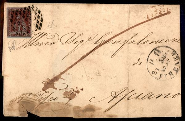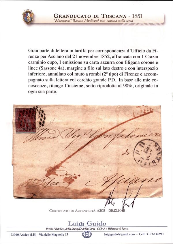 Grande frontespizio di busta affrancato con 1 crazia carminio cupo (4a) da Firenze a Asciano del 21.11.52 - uso isolato - Diena + cert. L. Guido