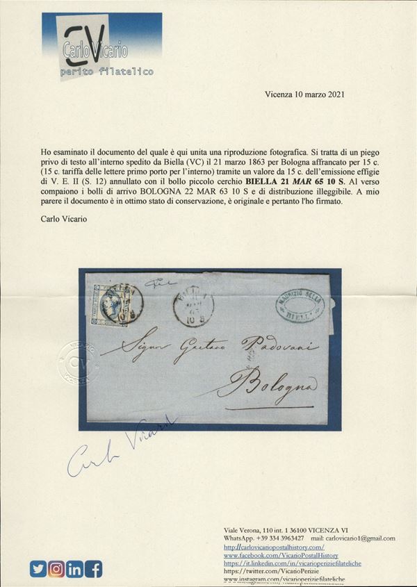 Involucro di lettera affrancato con 15 cent (12) da Biella a Bologna del 21.3.63 - cert Vicario