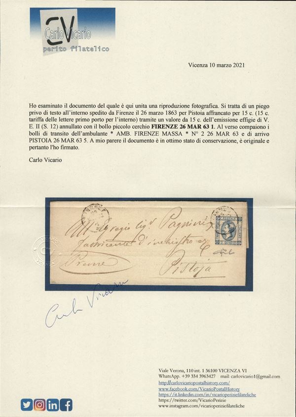 Involucro di lettera affrancato con 15 cent (12) da Firenze a Pistoia del 26.3.63 - cert Vicario