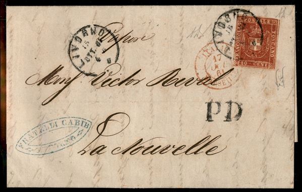Lettera affrancata con 40 cent carminio scarlatto (21b) da Livorno a La Nouvelle (Francia) via Piroscafo "Vapore" del 15.10.61 - interessante - Diena + cert. L. Guido