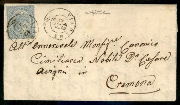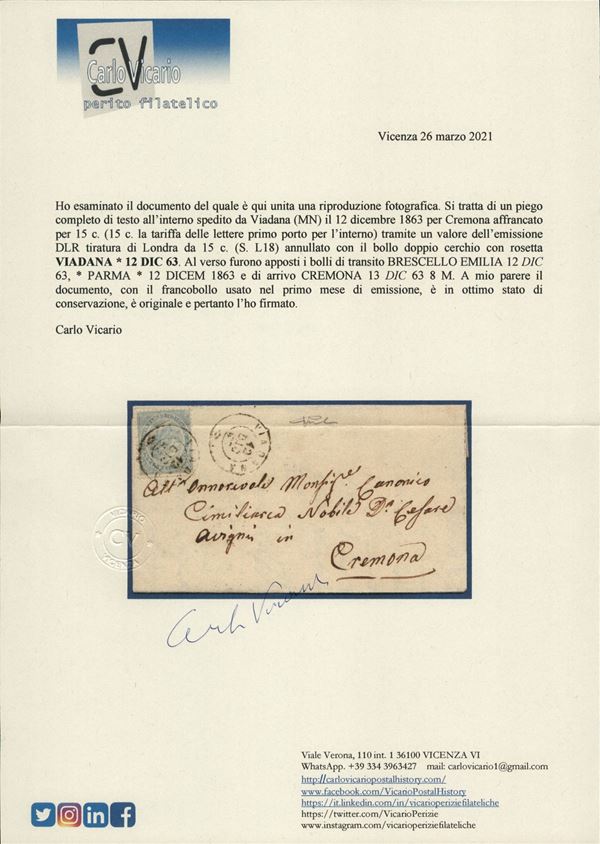 Lettera completa di testo affrancata con 15 cent DLR (L18) da Viadana a Cremona del 12.12.63 - primo mese d'uso - cert Vicario