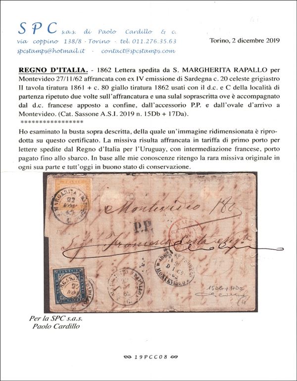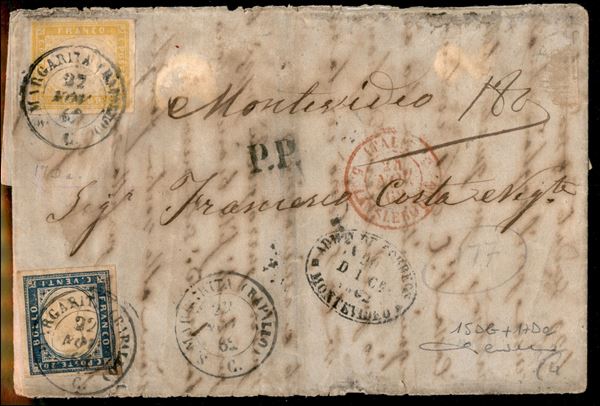 Lettera in tariffa affrancata con 20 cent (15Db) + 80 cent giallo (17D) da S. Margherita Rapallo a Montevideo (Uruguay) del 27.11.62 - rara destinazione - cert. Cardillo