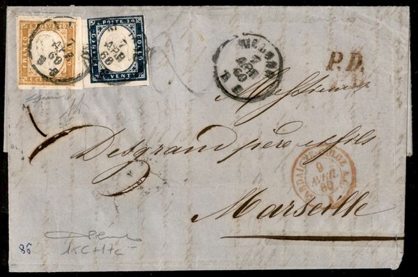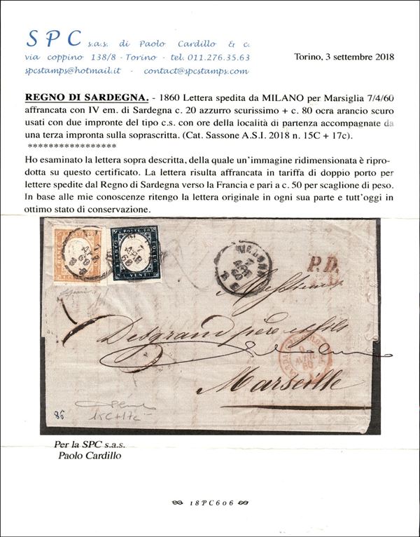 Lettera in tariffa di doppio porto affrancata con 20 cent azzurro scurissimo (15C) + 80 cent ocra arancio scuro (17c) da Milano a Marsiglia del 7.4.60 - Diena + Gazzi + cert. Cardillo