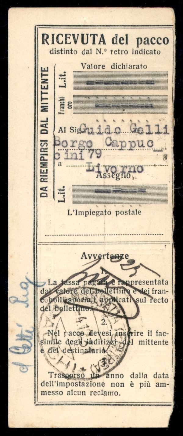 Pacchi Postali - Due metà destre (15+29) in uso misto su ricevuta di Bollettino da Massaua (Pacchi - punti 10) a Livorno del 14.12.31