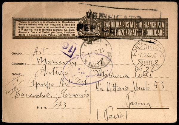 Posta da Campo N.773 - cartolina postale in franchigia (29) per Parona del 7.9.44