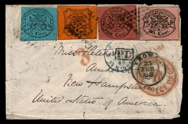 Quadricolore - 5 cent (16) + 10 cent (17) + 20 cent (18) + 80 cent (20) - bustina da Roma per gli USA del 23.2.1868