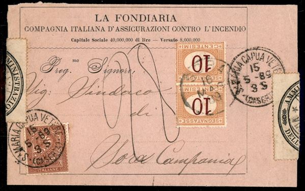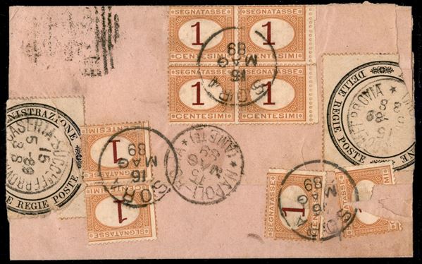 Quattro singoli e blocco di quattro del 1 cent (3) applicato al retro a chiudilettera + coppia del 10 cent (6) come tassa su circolare da S.M.C. Vetere a Sora del 15.5.89 affrancata per 2 cent (16) - due 1 cent Segnatasse strappati nell’uso