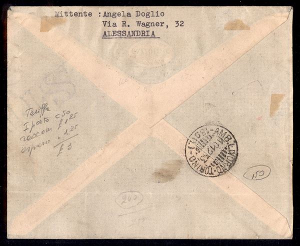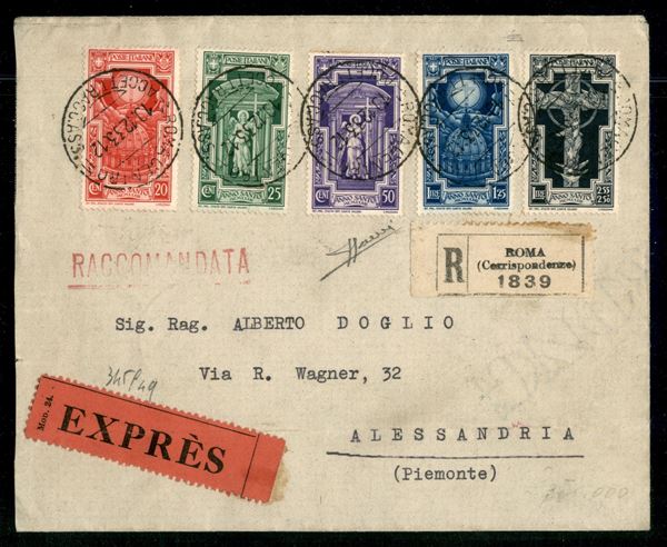 Raccomandata espresso affrancata con serie Anno Santo (345/349) da Roma a Alessandria del 10.12.33 - Gazzi + Sorani