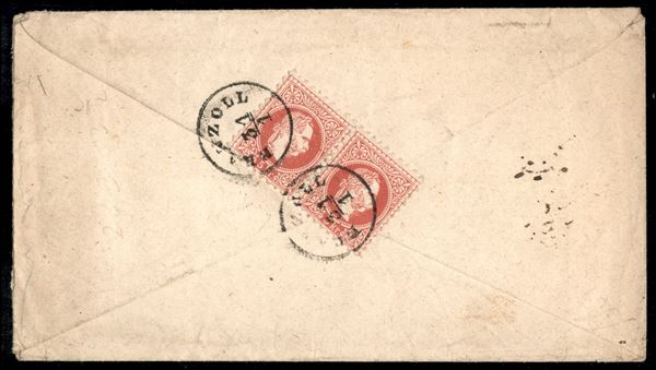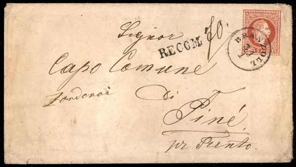 Recom. di Branzoll - busta postale da 5 kreuzer con affrancatura complementare al retro (33 coppia) da Branzoll a Pinč