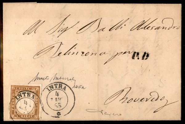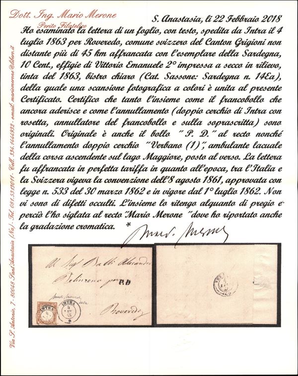 Reggio Limitrofo - Lettera affrancata con 10 cent (14Ea) da Intra a Roveredo (Svizzera) del 4.7.63 - Cardillo + cert. Merone
