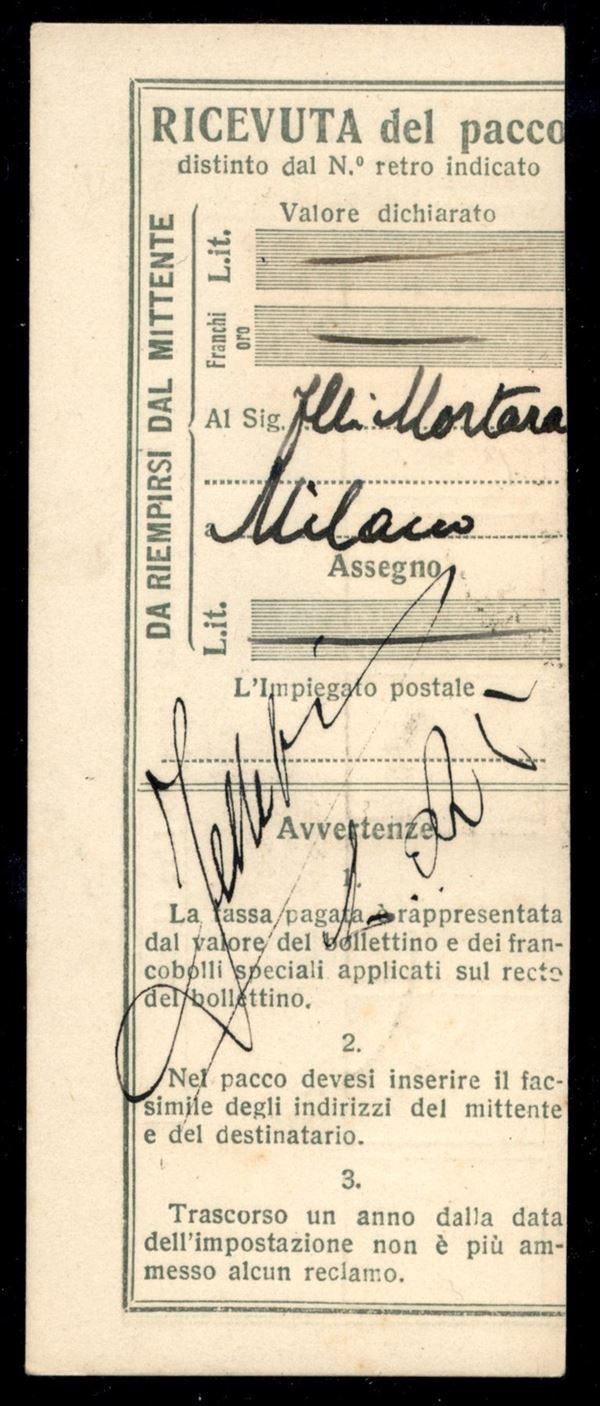 Ricevuta di Bollettino da Massaua (Pacchi - punti 10) a Milano del 10.8.31 con uso misto di valori per Pacchi (11 + 15 + 24 varietà) - 30 cent dentellature molto spostate (tipo bc - non catalogato)