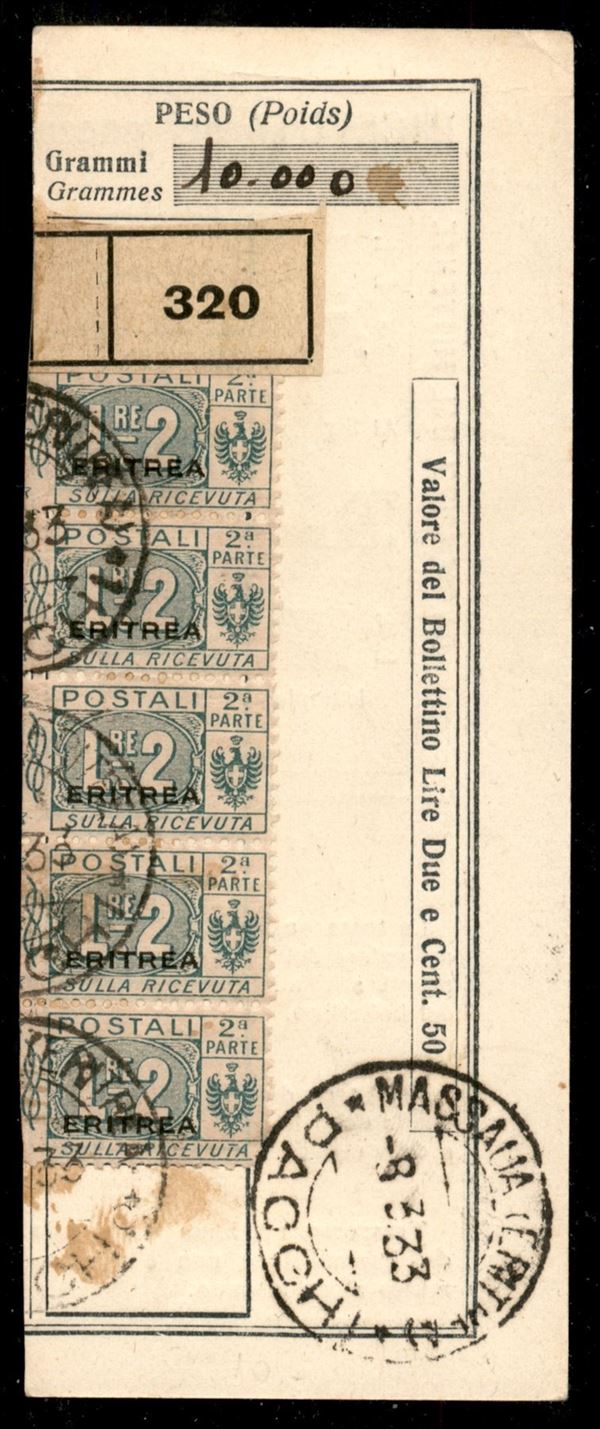 Striscia verticale di 5 della metà destra del 2 lire (15 - Pacchi Postali) usata su ricevuta di Bollettino da Massaua (Pacchi - punto 10) del 8.3.33