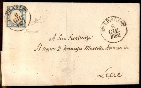 Trani - 2 grana (20) su lettera per Lecce del 6.6.1862 - Raybaudi