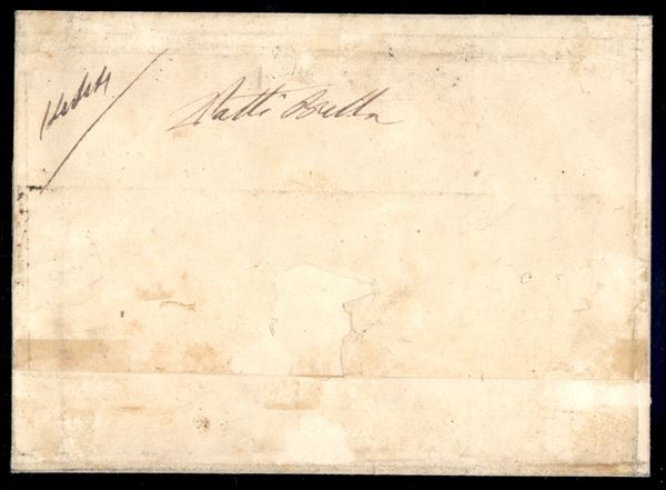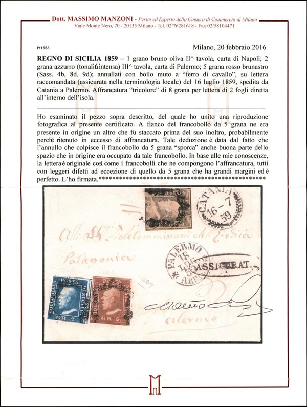 Tricolore - 1 grano bruno oliva (4b) + 5 grana rosso brunastro (9d) entrambi con ottimi margini + 2 grana azzurro (8d) corto di margini - assicurata da Catania a Palermo del 16.7.1859 - Em. Diena + cert. E. Diena