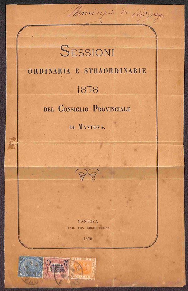 Tricolore - 10 cent (27) + 2 cent su 5 (30) + 20 cent (28) su copertina di stampato da Mantova a Pegognaga del 14.6.1879 - non fresco