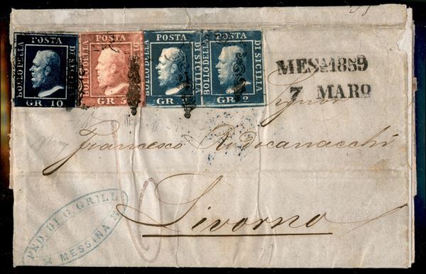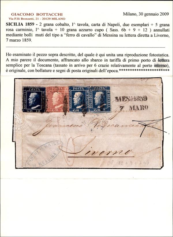 Tricolore - 10 grana (12) + 5 grana (9) + due grana (6b) - lettera da Messina a Livorno del 7.3.1859 - difetti - da esaminare - Emilio Diena + G. Oliva + cert. G. Bottacchi