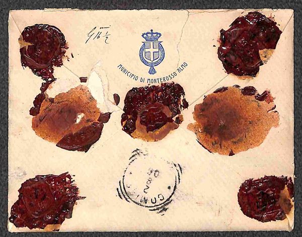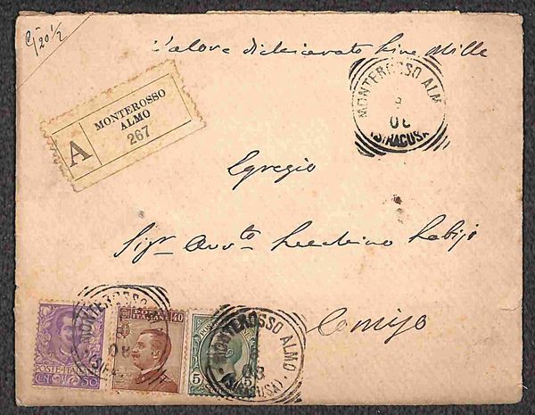Tricolore mista - 50 cent Floreale (76) + 5 cent Leoni (81) + 40 cent Michetti (84) - assicurata da Monterosso Almo a Comiso del 1.8.08