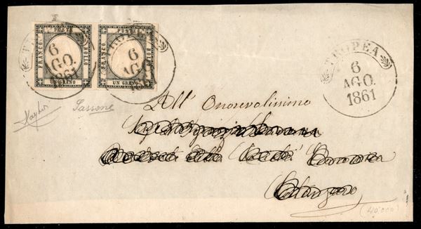 Tropea - coppia del 1 grano (19a) su frontespizio di lettera per Catanzaro del 6.8.1861 - Raybaudi