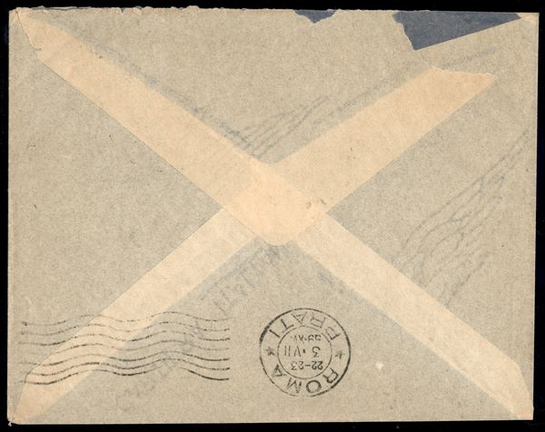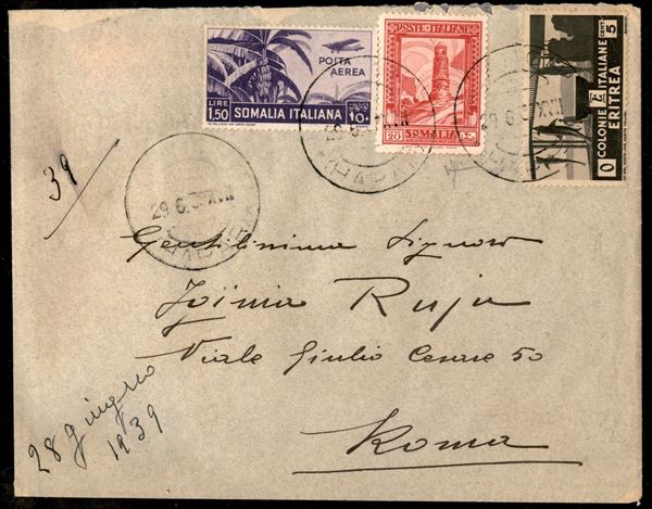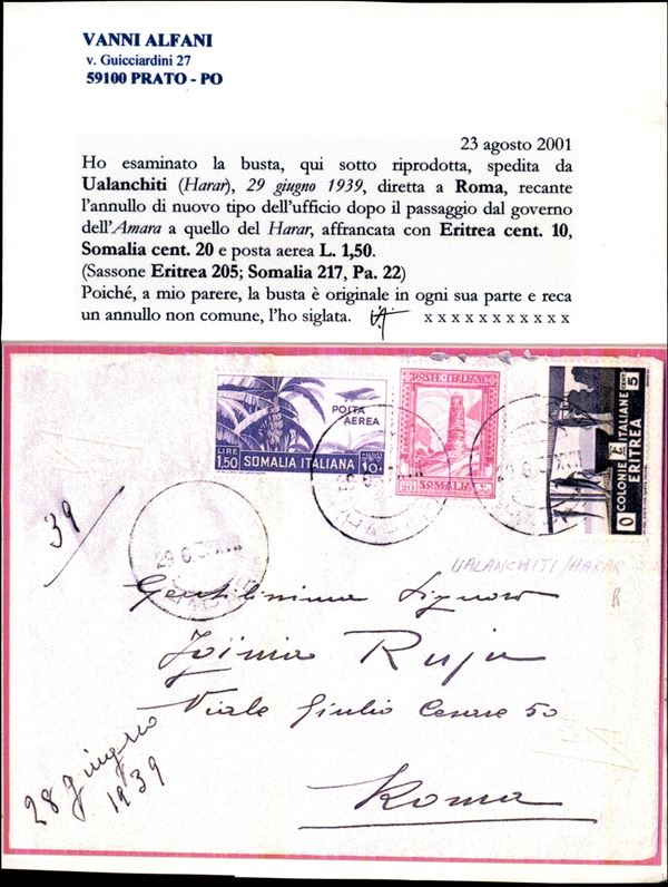 Ualanchiti Harar (leggermente impresso) - aerogramma per Roma del 23.6.39 con affrancatura mista (217 + 22 Aerea + 205 Eritrea) - cert. Alfani