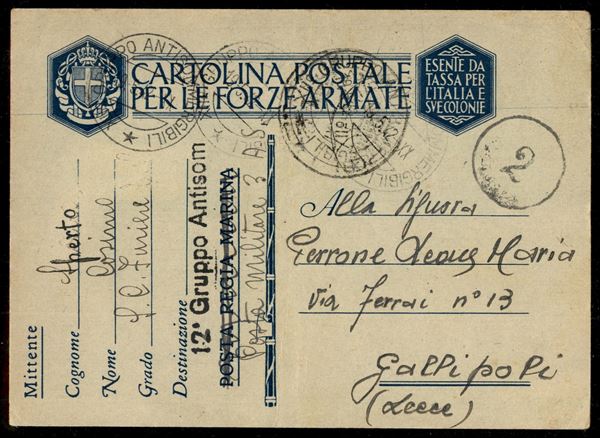 XII Gruppo Antisommergibili - cartolina postale in franchigia per Gallipoli del 19.5.42